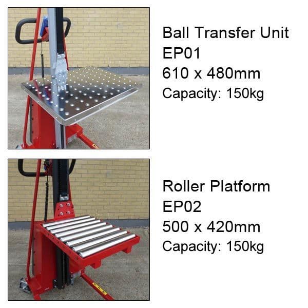 The lifter comes with a platform and forks as standard, but other attachments are available (see example photos). Please contact us if you would like the mini-stacker fitted with another type of attachment.